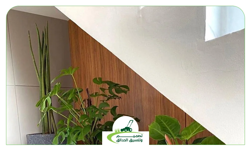 1. الإضاءة والبيئة: تنسيق المناطق العلوية أو الدرابزين يعتمد غالبًا على الإضاءة المفتوحة والتهوية الطبيعية، مما يسمح باستخدام نباتات معينة، أما تنسيق تحت الدرج، فيتعامل مع بيئة قد تكون مظلمة أو محدودة الإضاءة (Low Light)، مما يتطلب اختيار نباتات ظل خاصة مثل “زاميا” (ZZ plant) أو “سنسيفيريا” (Snake plant) التي تتحمل قلة الضوء، كما ورد في أدلة النباتات الداخلية.